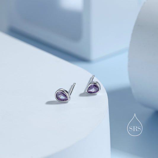 Extra Tiny Amethyst Purple Droplet CZ Stud Earrings in Sterling Silver, Tiny Pear Cut Bezel CZ Stud Earrings, February Birthstone