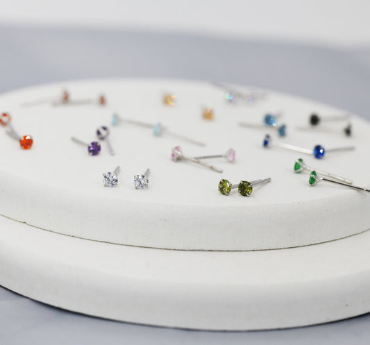 Sterling Silver Tiny Birthstone Stud Earrings, 3mm Birthstone CZ Earrings, Three Prong, Stacking Earrings