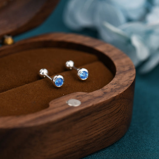 Tiny Aquamarine Blue CZ Barbell Earrings in Sterling Silver, 3mm CZ Screw Back Dot Earrings, Screwback Earrings, March Birthstone