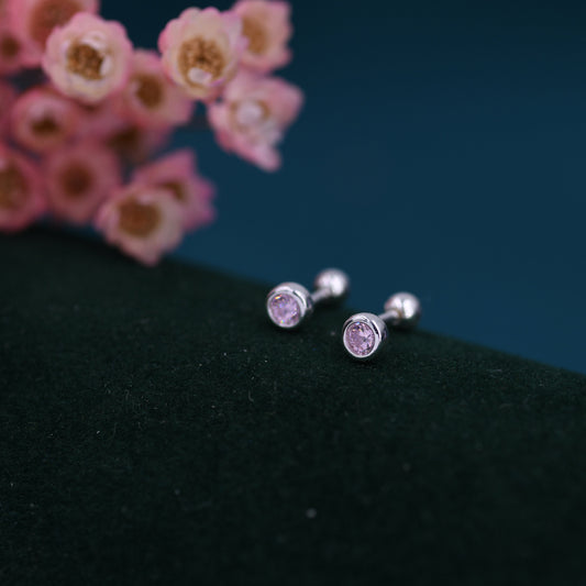 Tiny Pink CZ Barbell Earrings in Sterling Silver, 3mm or 4mm CZ Screw Back Dot Earrings, Screwback Earrings, October Birthstone