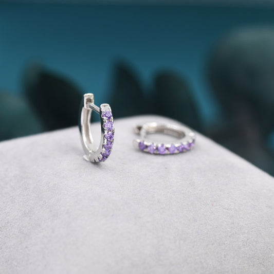 Amethyst Purple CZ Huggie Hoops in Sterling Silver, Silver or Gold, Minimalist Hoop Earrings, 8mm Hoops, Purple Hoops, February Birthstone