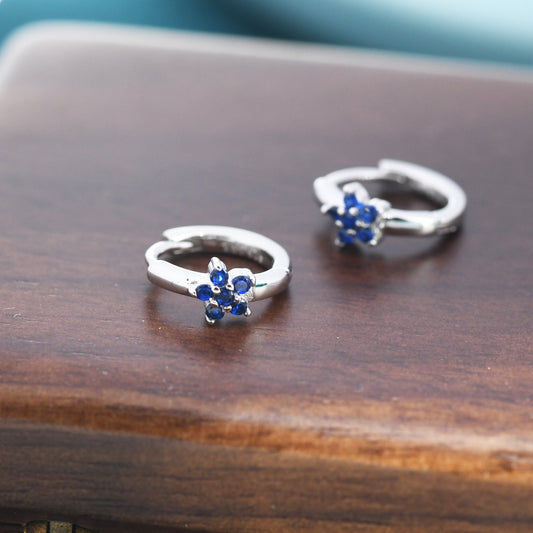 Tiny Sapphire Blue CZ Flower Huggie Hoops, CZ Hoop Earrings, Crystal Flower Huggie Earrings, September Birthstone