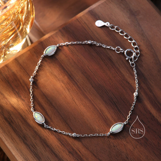 White Fire Opal Marquise Satellite Bracelet in Sterling Silver, Silver or Gold, Simulated Opal Bracelet, Marquise Opal Motif Bracelet