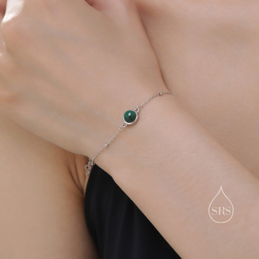 Genuine Malachite Bracelet in Sterling Silver, Natural Malachite Bracelet, Silver Single Malachite Bracelet with Satellite Chain