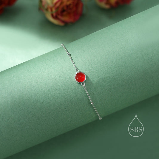 Genuine Red Onyx Bracelet in Sterling Silver, Natural Red Onyx Bracelet, Silver Single Red Carnelian Bracelet with Satellite Chain