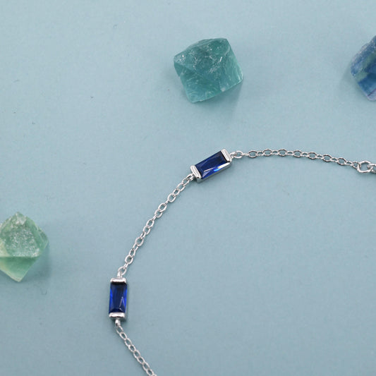 Sapphire Blue CZ Baguette Satellite Bracelet in Sterling Silver, Silver or Gold, Baguette CZ Bracelet, Chain Bracelet, Delicate CZ Bracelet