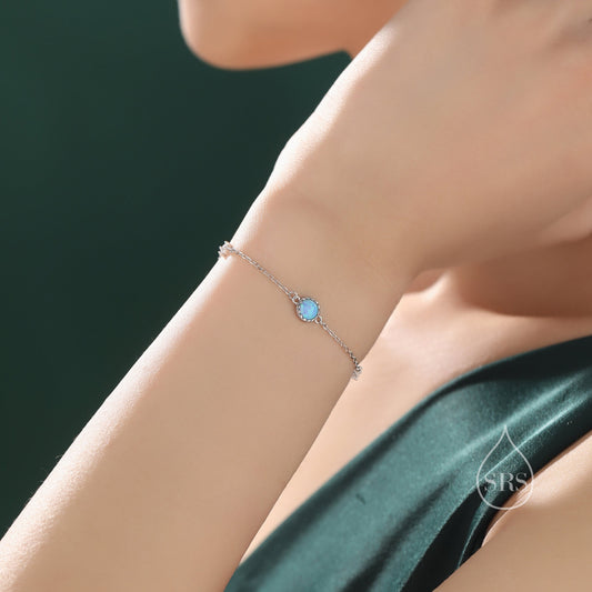 Delicate Blue Opal and CZ Bracelet in Sterling Silver, Simulated Moonstone Bracelet, Silver Single Opal Bracelet with Satellite Chain