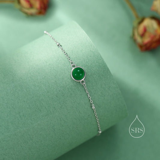 Genuine Green Onyx Bracelet in Sterling Silver, Natural Green Onyx Bracelet, Silver Single Green Onyx Bracelet with Satellite Chain