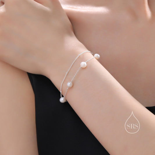Sterling Silver Natural Pearl Double Layer Bracelet, Single Genuine Pearl Bracelet, Dainty Freshwater Pearl Bracelet, Silver or Gold