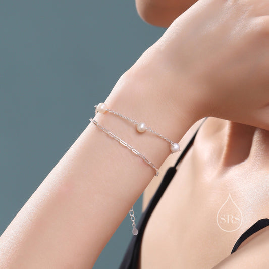 Double Layer Natural Pearl Beaded Bracelet in Sterling Silver with Paperclip Chain, Two Layer Satellite Genuine Freshwater Pearl Bracelet