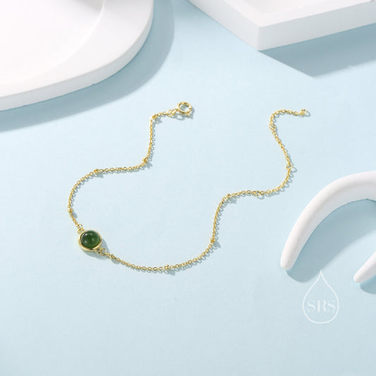 Genuine Jasper Jade Bracelet in Sterling Silver, Natural Green Jade Bracelet, Silver Single Jade Bracelet with Satellite Chain