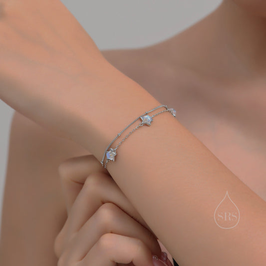 Double Layer Moonstone Star Trio Bracelet in Sterling Silver, Silver or Gold, Simulated Moonstone Star Bracelet, Two Layer Star Bracelet