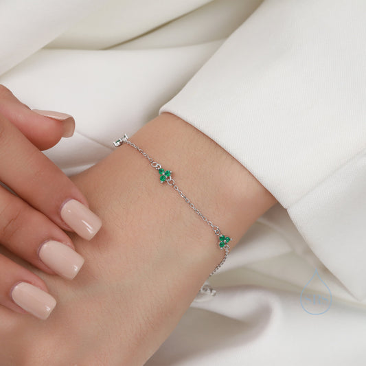 Tiny CZ Trio Bracelet in Sterling Silver, Silver or Gold , Tiny trefoil Emerald Green and clear Bracelet, CZ Three Crystal Bracelet