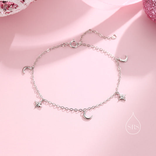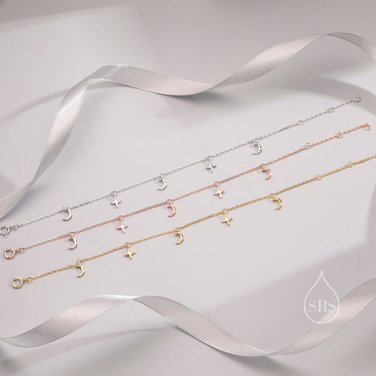 Sterling Silver Moon and Star Bracelet, Silver or Gold or Rose gold, Moon and Star Charm Bracelet, Celestial Jewellery