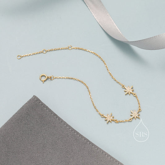 Starburst CZ Bracelet in Sterling Silver, Silver or Gold or Rose Gold, Three Star Bracelet, North Star Bracelet, Sunburst Bracelet, Star