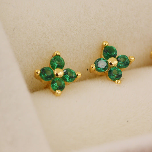 CZ Flower Stud Earrings in Sterling Silver, Crystal Flower Earrings, Amethyst, Ruby, Emerald and Black Diamond, Four Crystal Stud