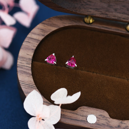 Trillion Cut Ruby Red CZ Stud Earrings in Sterling Silver, Silver or Gold, Hot Pink Cubic Zirconia Crystal Earrings