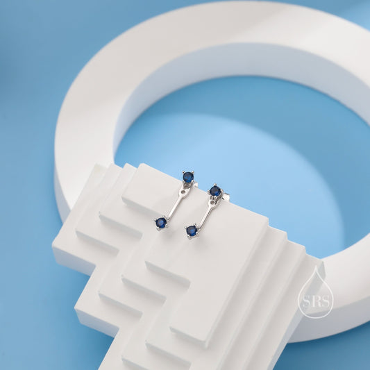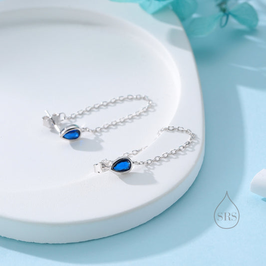 Tiny Sapphire Blue Droplet CZ Dangle Chain Stud Earrings in Sterling Silver, Silver or Gold, Pear Shape Ear Jacket, Front and Back Earrings