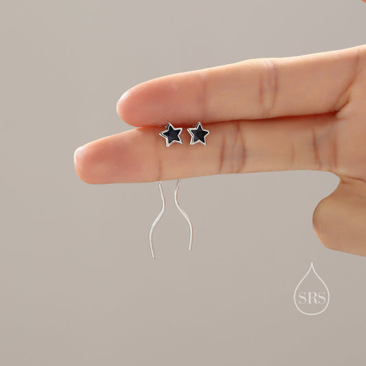 Black Star Bezel CZ Crystal Threader Earrings in Sterling Silver, Silver or Gold, Minimalist Star Cut Ear Threaders