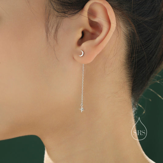 Moon and Star CZ Dangle Earrings in Sterling Silver, Moon and Starburst CZ Dangle Earrings, Silver, Gold or Rose Gold, Front and Back