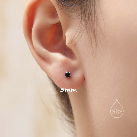 Prong Set Black CZ Stud Earrings in Sterling Silver, Silver or Gold, 3mm, 4mm, 5mm, 6mm 6 Prong CZ Earrings