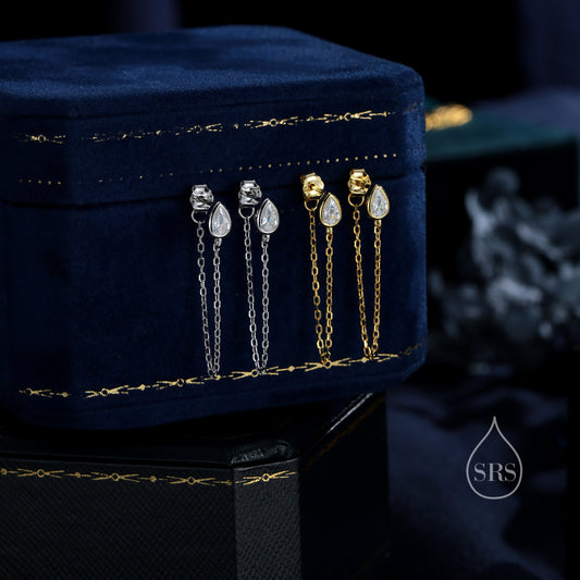 Tiny Droplet CZ Dangle Chain Stud Earrings in Sterling Silver, Silver or Gold, Pear Shape Ear Jacket, Front and Back Earrings