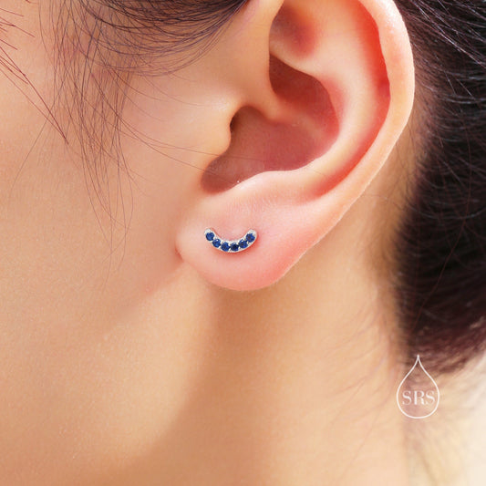 Sapphire Blue CZ Curved Bar Tiny Stud Earrings in Sterling Silver, Silver or Gold, Tiny CZ Bar Stud, Geometric Bar Earrings