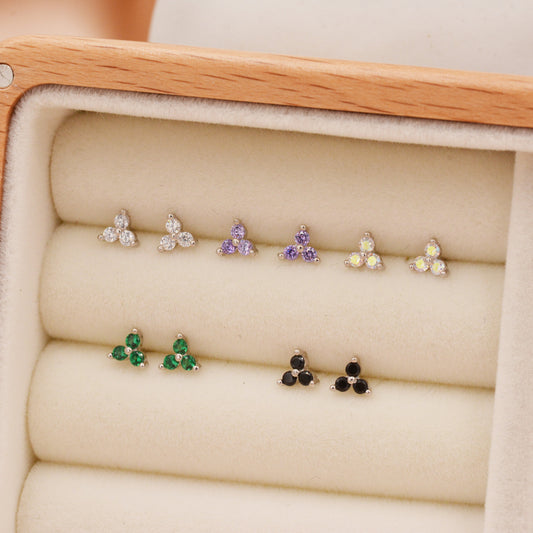 Tiny Emerald Green Trinity CZ Stud Earrings in Sterling Silver - Gold or Silver, Green CZ Three Crystal Stud Earrings, Emerald Trefoil Stud