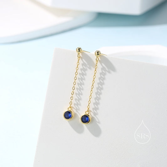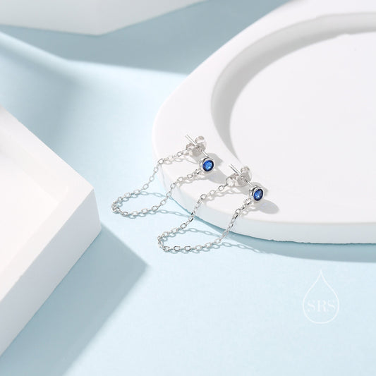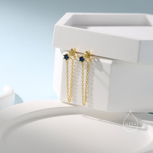 Sapphire Blue CZ with Chain Dangle Stud Earrings in Sterling Silver, Silver or Gold, Blue CZ Drop Earrings