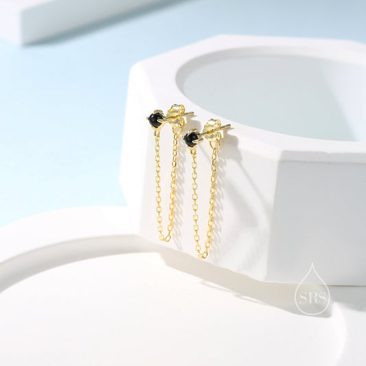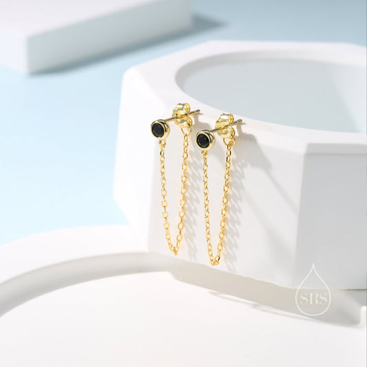 Natural Black Onyx and Chain Ear Jacket in Sterling Silver, Silver or Gold, Black Agate Prong Earrings, Front and Back Earrings