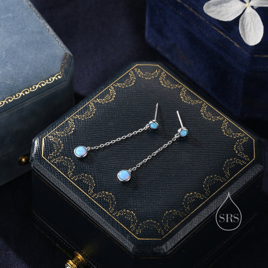 Double Blue Opal Dangle Chain Earrings in Sterling Silver, Silver or Gold, Lab Opal Earrings, Two Opal Earrings, Blue Opal