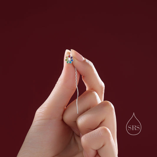 Enamel Smiling Flower Threader Earrings in Sterling Silver, Silver Rainbow Flower Earrings, Multi Colour Flower Spiral Ear Threaders