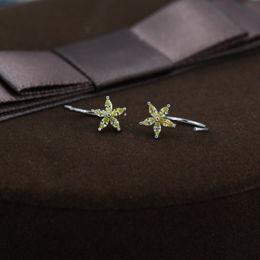 Citrine Yellow CZ Flower Huggie Hoop Earrings in Sterling Silver, Gold or Silver, Marquise CZ Flower Threader Hoop Earrings, Pull Through