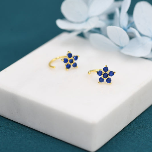 Sapphire Blue CZ Flower Huggie Hoop Earrings in Sterling Silver, Gold or Silver, CZ Flower Threader Hoop Earrings, Pull Through, C Shape