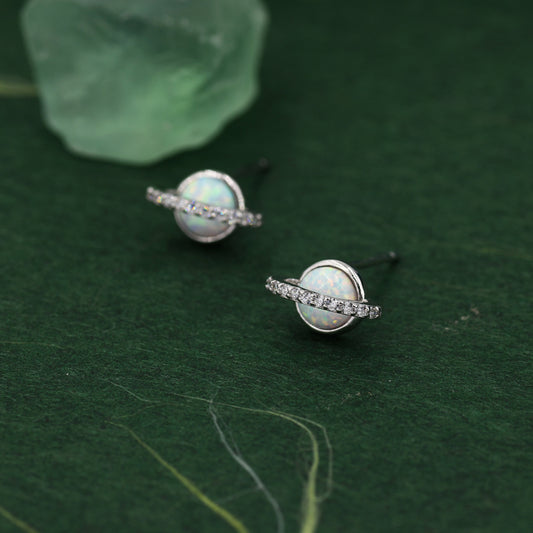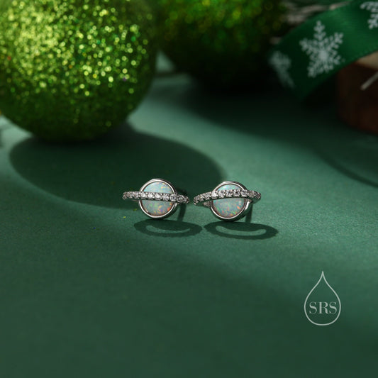White Opal and CZ Halo Planet Stud Earrings in Sterling Silver, Lab Opal Planet Earrings, Fire Opal Saturn Earrings