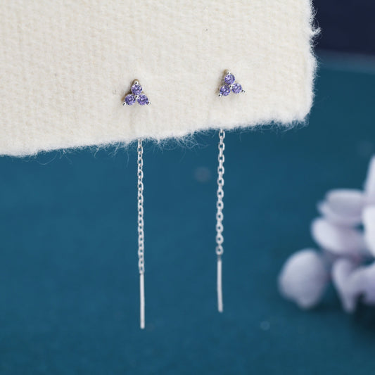 Purple CZ Trio Flower Threader Earrings in Sterling Silver, Silver or Gold, Three Dot Crystal Ear Threaders, Flower CZ Earrings