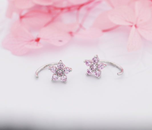 Light Pink CZ Flower Huggie Hoop Earrings in Sterling Silver, Gold or Silver, CZ Flower Threader Hoop Earrings, Pull Through, C Shape