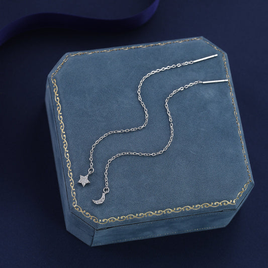 Asymmetric Tiny Moon and Star CZ Threader Earrings in Sterling Silver, Silver, Gold or Rose Gold, Moon and Star Ear Threaders