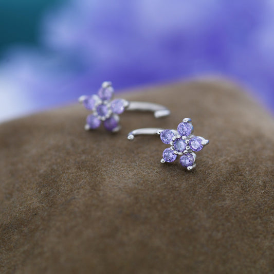 Amethyst Purple CZ Flower Huggie Hoop Earrings in Sterling Silver, Gold or Silver, CZ Flower Threader Hoop Earrings, Pull Through, C Shape