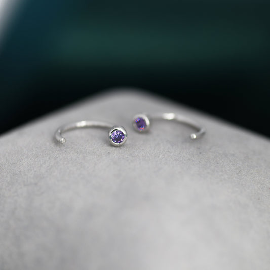 2mm Amethyst Purple CZ Huggie Hoop Earrings in Sterling Silver, Silver or Gold, Half Hoop, Open Hoop, Pull Through, February Birthstone