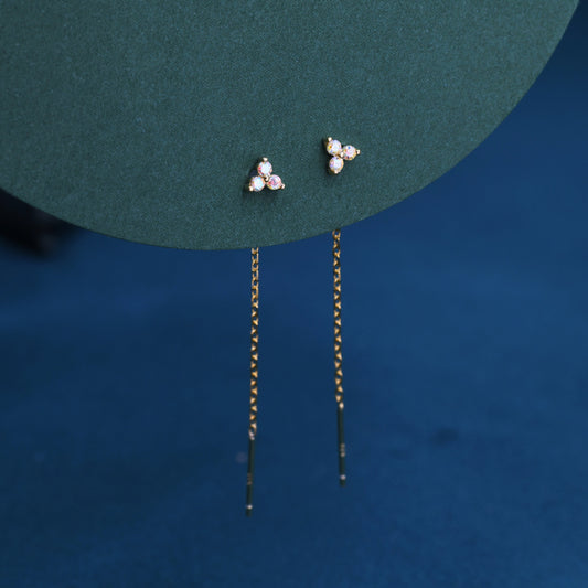 Aurora Borealis Three CZ Trinity Threader Earrings in Sterling Silver, Three Dot AB Crystal Ear Threaders, Trefoil Moonstone Earrings