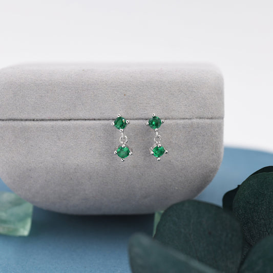 Tiny Emerald Green Double CZ Dangle Stud Earrings in Sterling Silver, Silver or Gold, Two CZ Prong Earrings, Solid Silver Crystal Earring