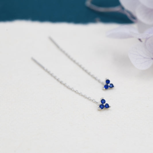 Sapphire Blue Trio Flower CZ Threader Earrings in Sterling Silver, Silver or Gold, Three Dot Crystal Ear Threaders, Flower CZ Earrings