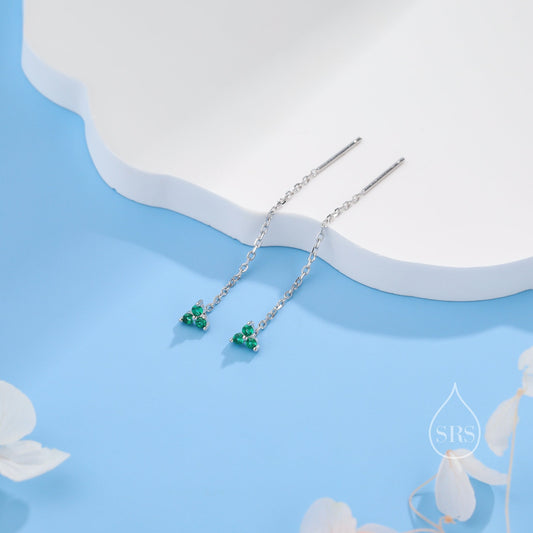 Emerald Green CZ Trio Flower Threader Earrings in Sterling Silver, Silver or Gold, Three Dot Crystal Ear Threaders, Flower CZ Earrings
