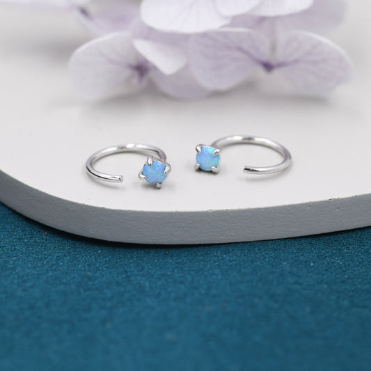 Blue Opal Huggie Hoop Earrings in Sterling Silver, 3mm or 4mm Tiny Opal Open Hoop Earrings, Opal Pull Through Threaders, Half Hoops,