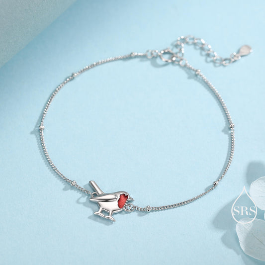 Delicate Robin Bird Bracelet in Sterling Silver with a Satellite Chain, Nature Inspired Bird Jewellery, Minimalist, Simple and Tiny