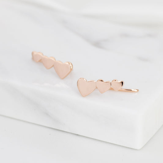 Sterling Silver Three Heart Crawler Earrings, Silver, Gold or Rose Gold, Triple Hearts Climber Earrings, Ear Climbers