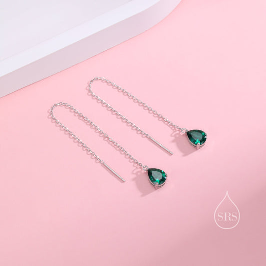 Emerald Green Droplet CZ Threader Earrings in Sterling Silver, Silver or Gold, Pear Cut CZ Long Ear Threaders, Sparkly CZ Threaders