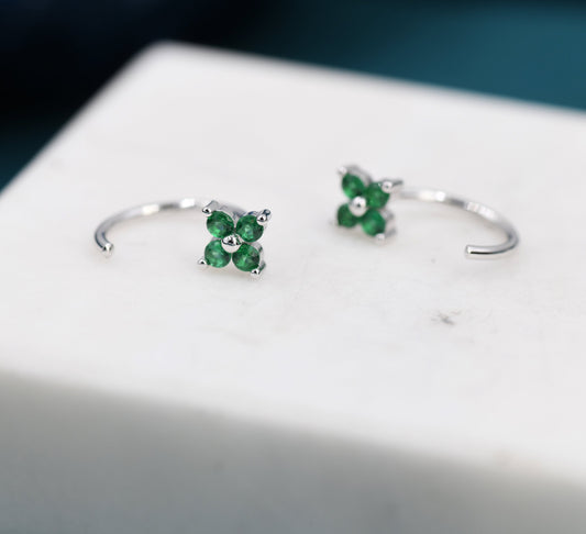 Emerald Green CZ Hydrangea Flower Huggie Hoop Earrings in Sterling Silver, Tiny Green CZ Trio Open Hoops, Pull Through Threaders, Half Hoops