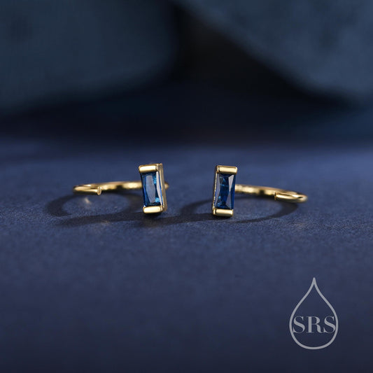 Sapphire Blue Baguette Cut CZ Huggie Hoop Earrings in Sterling Silver, Silver or Gold, Open Hoops, Pull-Through Threader Earrings